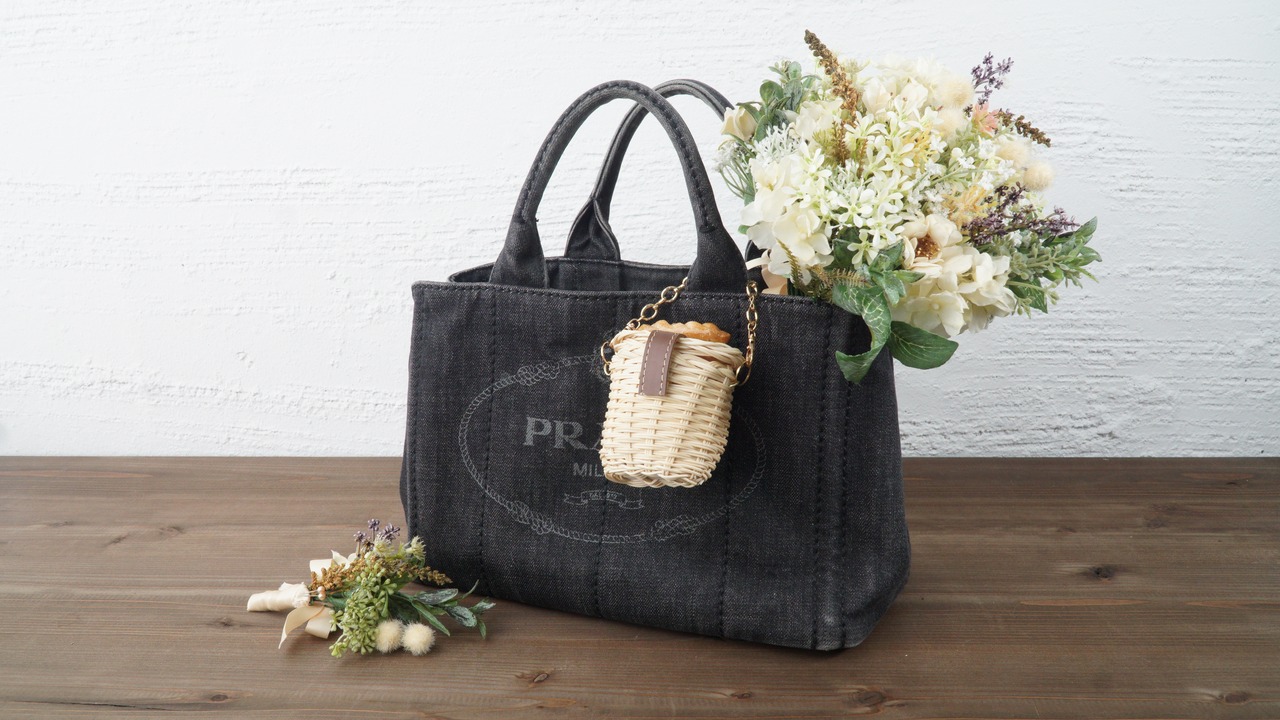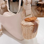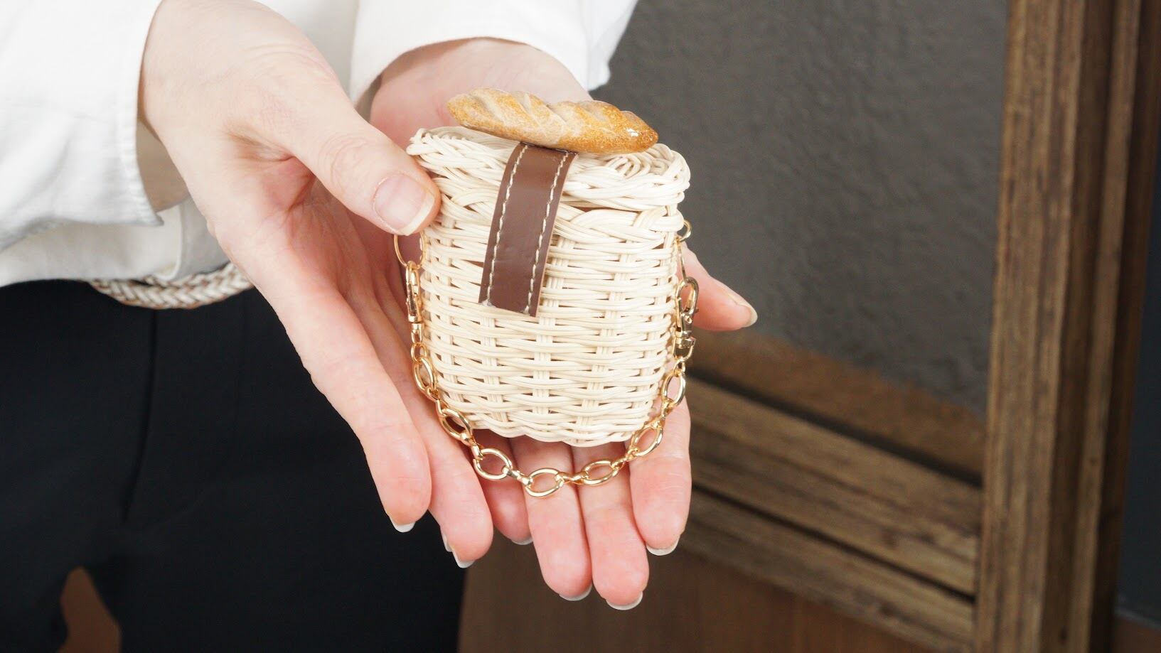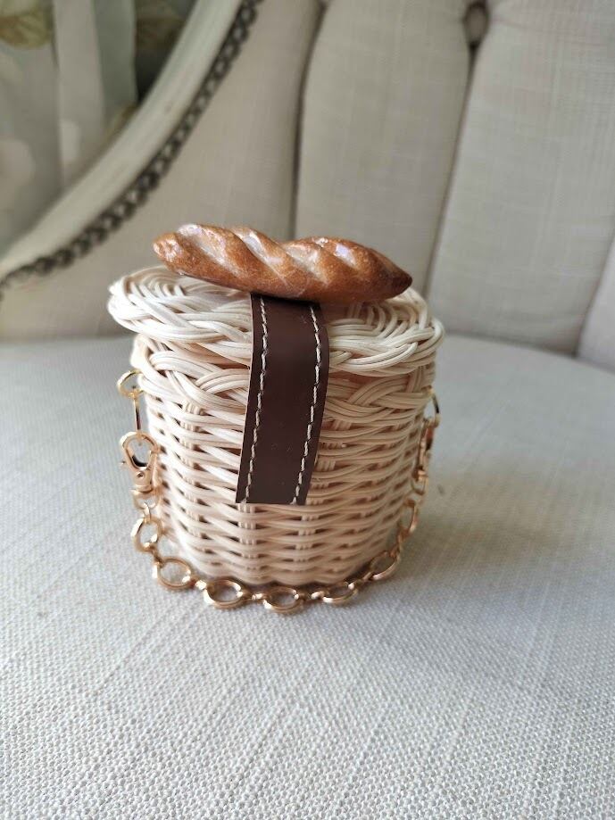こちらは、ミニチュアのバゲットがついたカゴタイプです。特徴は、なんと言ってもバゲット!!クリエイターさんが、本物のパンの素材で作っていますので、リアルです。カゴももちろん手編みです。カゴにバゲットって?というその意外性が、人目を引くこと間違いないです。きっと、そこから誰かと会話が始まり、コミュニケーションが生まれるでしょう!